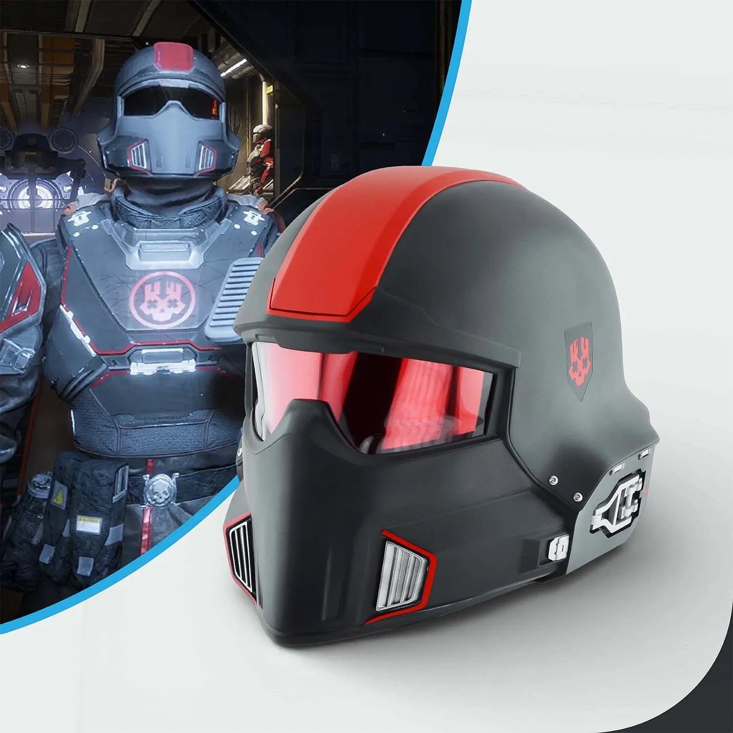 This costume features a different color scheme (Black and Crimson), a unique emblem, and a distinct cape, setting it apart from the original Helldivers gear.